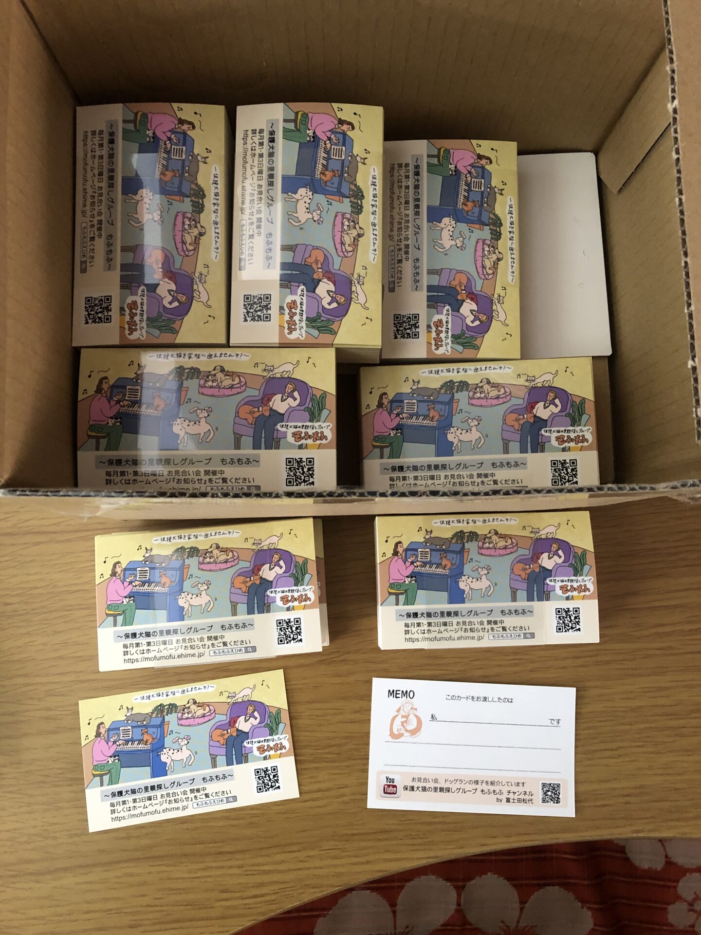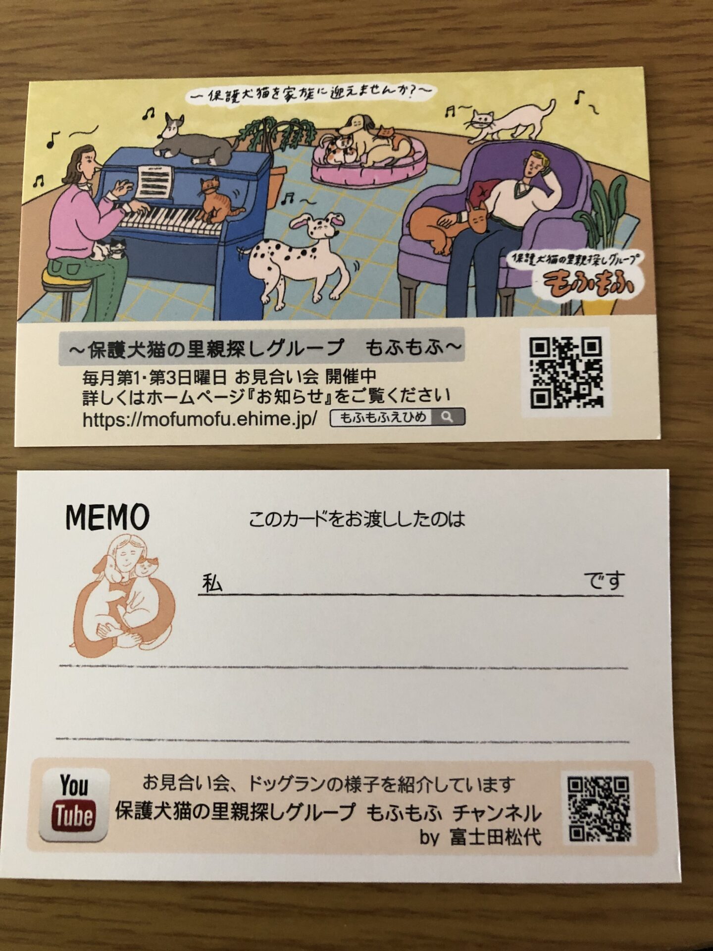 毎月第1・3日曜日に開催しているお見合い会などのイベントでカードを配布し、『もふもふっ子』たちだけでなく保護犬猫全体に関心を持っていただくことで里親探しに繋がることを願っています。